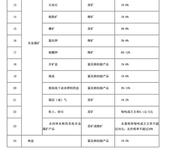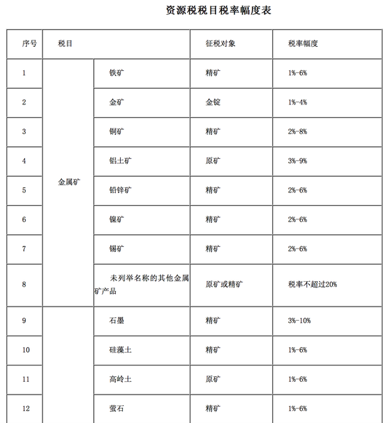 1.對《資源稅稅目稅率幅度表》(見附件)中列舉名稱的21種資源品目和未列舉名稱的其他金屬礦實行從價計征,計稅依據由原礦銷售量調整為原礦、精礦(或原礦加工品)、氯化鈉初級產品或金錠的銷售額。列舉名稱的21種資源品目包括:鐵礦、金礦、銅礦、鋁土礦、鉛鋅礦、鎳礦、錫礦、石墨、硅藻土、高嶺土、螢石、石灰石、硫鐵礦、磷礦、氯化鉀、硫酸鉀、井礦鹽、湖鹽、提取地下鹵水曬制的鹽、煤層(成)氣、海鹽。