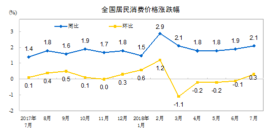 央廣網(wǎng)北京8月9日消息 國家統(tǒng)計局今日發(fā)布的數(shù)據(jù)顯示,2018年7月份,全國居民消費價格同比上漲2.1%。其中,城市上漲2.1%,農(nóng)村上漲2.0%;食品價格上漲0.5%,非食品價格上漲2.4%;消費品價格上漲1.8%,服務(wù)價格上漲2.5%。1-7月平均,全國居民消費價格比去年同期上漲2.0%。