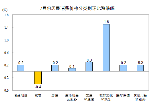 7月份,全國居民消費價格環(huán)比上漲0.3%。其中,城市上漲0.4%,農(nóng)村上漲0.1%;食品價格上漲0.1%,非食品價格上漲0.3%;消費品價格上漲0.1%,服務(wù)價格上漲0.7%。