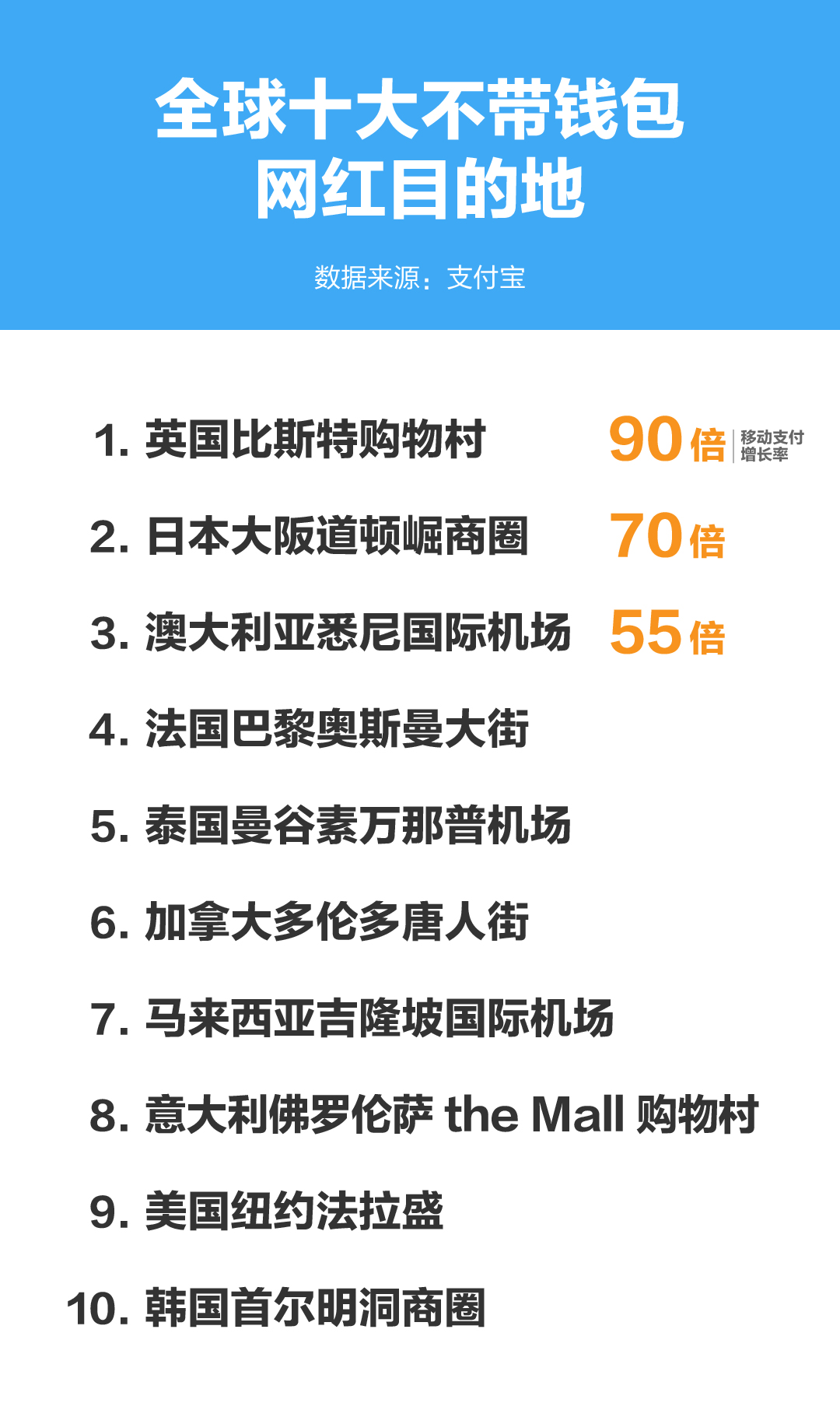 其余進入增速最高前十大不帶錢包目的地依次為:日本大阪道頓崛商圈、澳大利亞悉尼國際機場、法國巴黎奧斯曼大街、泰國曼谷素萬那普機場、加拿大多倫多唐人街、馬來西亞吉隆坡國際機場、意大利佛羅倫薩THE MALL購物村、美國紐約法拉盛、韓國首爾明洞商圈。