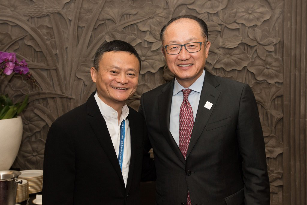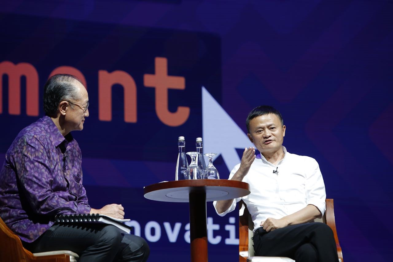 世界銀行行長金墉和阿里巴巴董事局主席馬云進(jìn)行“數(shù)字平臺和創(chuàng)新如何改變發(fā)展中國家未來”的對話