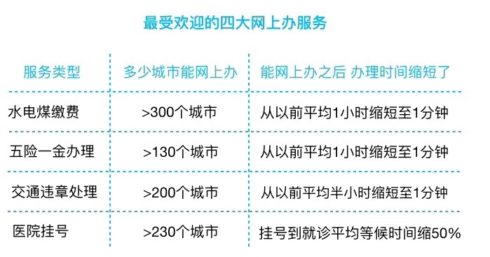 現(xiàn)在能全國(guó)超過300個(gè)城市,有100多類服務(wù)實(shí)現(xiàn)了網(wǎng)上辦理,老百姓常用的熱門服務(wù)中,超過一半開始能夠網(wǎng)上辦理。其中水電煤繳費(fèi)、五險(xiǎn)一金的查詢與提取、交通違章信息查詢和處理、醫(yī)院遠(yuǎn)程掛號(hào)是老百姓使用最多,最歡迎的四大服務(wù)。