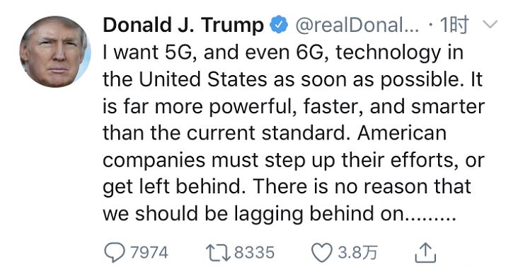 我希望美國盡可能快地發(fā)展5G,甚至6G技術(shù),那會比當前的標準更強、更快、更智能。美國公司必須加緊努力,否則就會落后。在那些明顯代表未來的領(lǐng)域,美國沒有被人甩在身后的理由。我希望美國公司能夠通過競爭去獲勝,而不是靠封殺當下更先進的技術(shù)。不論在我們從事的哪個領(lǐng)域,美國都必須是領(lǐng)導者,尤其是在令人興奮的科技世界!
