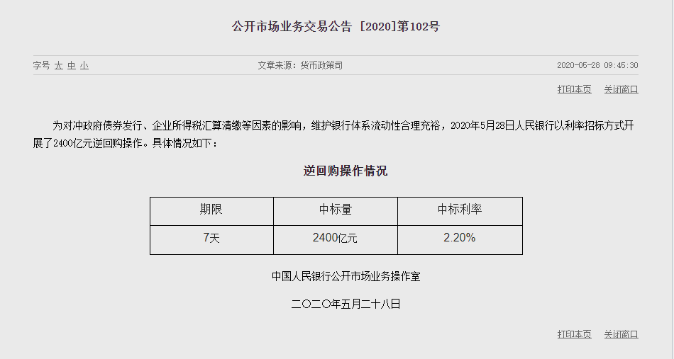 央行解釋稱,開(kāi)展2400億元逆回購(gòu)操作是為對(duì)沖政府債券發(fā)行、企業(yè)所得稅匯算清繳等因素的影響,維護(hù)銀行體系流動(dòng)性合理充裕。此次中標(biāo)利率依然與上次持平,仍為2.20%,期限為7天。
