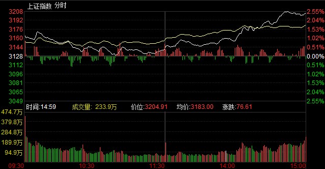 央廣網(wǎng)財經(jīng)北京2月3日消息 據(jù)經(jīng)濟(jì)之聲《交易實況》報道,兩市沖高回落。下午繼續(xù)走高。金融股暴漲,創(chuàng)業(yè)板迎來新紀(jì)元。截至收盤,滬指報3204.91點,上漲76.61點,漲幅2.45%,成交2834億元;深成指報11209.1點,上漲246.05點,漲幅2.24%,成交2339億元;創(chuàng)業(yè)板指報1750.91點,上漲54.08點,漲幅3.19%,成交540.5億元。