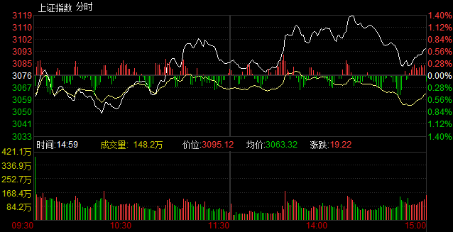 央廣網財經北京2月9日消息 據經濟之聲《交易實況》報道,兩市開盤漲跌互現,在券商、保險等板塊的帶動下,滬指有所回升,午后兩點十四分左右出現高點3118點,隨后震蕩小幅下滑。截至收盤,滬指報3095.12點,上漲19.22點,漲幅0.62%,成交2407億元;深成指報10868.1點,上漲77.04點,漲幅0.71%,成交1954億元;創(chuàng)業(yè)板指報1708.85點,下跌22.12點,跌幅1.28%,成交415.6億元。