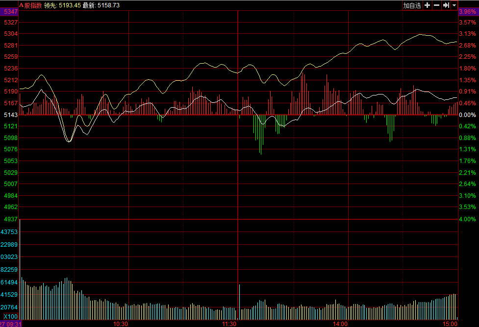 今天兩市先抑后揚,滬指順利實現(xiàn)了7連陽,而中小板、創(chuàng)業(yè)板指數(shù)再次創(chuàng)出歷史的新高。板塊方面,今天像一些采集、鋼鐵、有色板塊出現(xiàn)了補(bǔ)漲,而金融、權(quán)重、建筑、建材、機(jī)械、設(shè)備都是相對來講表現(xiàn)良好。農(nóng)林牧漁也是漲幅居前,而非銀金融、傳媒包括一些銀行股出現(xiàn)了回調(diào)的局面,概念股方面包括次新股也是漲幅比較好,像網(wǎng)絡(luò)安全漲幅居前,今天上市的流通的9只新股,均無懸念達(dá)到44%的漲幅,在面臨5千點左右的關(guān)口之下,今天市場再次迎來了滬深兩市均破超過萬億的成交額。怎樣看待這樣一個盤面?