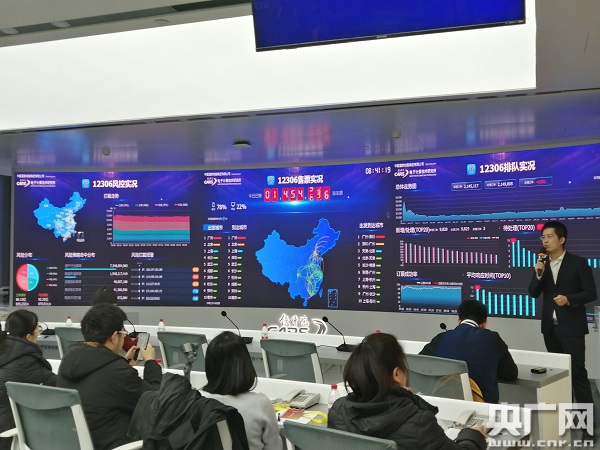 在12306客票系統(tǒng)監(jiān)控中心的大屏幕上,售票實況正在實時更新,以每秒幾百張的速度增加,北京、滬寧杭、廣深至武漢、成渝、貴昆等熱門線路在地圖上突出顯示。