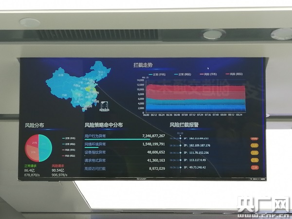大屏幕上顯示,早上8點半,當天車票開售2個半小時,就已經(jīng)接到近180億次訪問請求,其中正常請求86億次,風險請求超過90億次。