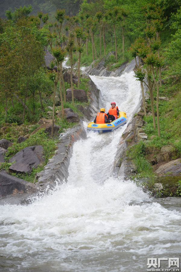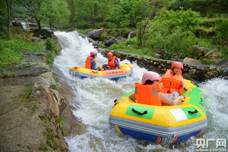 當天下午1點多鐘,各地游客紛涌而至,大家穿上泳衣爭先恐后地坐上皮筏艇,體驗水上極速的樂趣。在河道中,皮筏艇一個接著一個從上游漂下,游客們一路尖叫一路歡笑,讓人心跳加速,大家盡情地享受著河水帶來的清涼,大呼過癮。來自陜西的陶女士漂完全程后,開心地說:“婺源不僅風景很美,漂流也非常的刺激過癮,不虛此行!