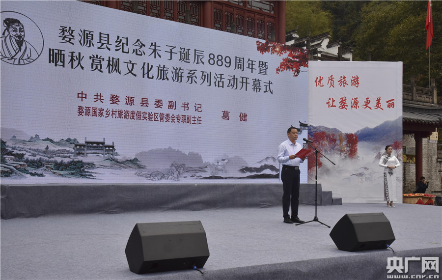 婺源縣委副書記、婺源國家鄉(xiāng)村旅游度假實(shí)驗(yàn)區(qū)管委會(huì)專職副主任葛健宣布紀(jì)念朱子誕辰889周年暨曬秋賞楓文化旅游系列活動(dòng)主要活動(dòng)內(nèi)容