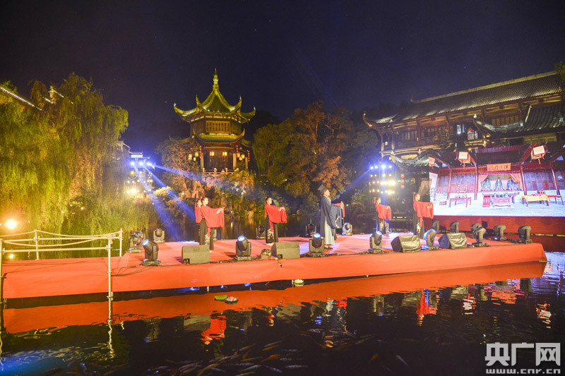 華燈初上,為戲劇表演搭建的熹園水上舞臺(tái)燈光璀璨,臨湖長(zhǎng)凳高朋滿座。在這座穿越千年的綠意葳蕤江南園林中,所有目光聚集在流光溢彩的舞臺(tái)上,成百上千的戲曲迷早早地聚集在熹園,翹首以盼。