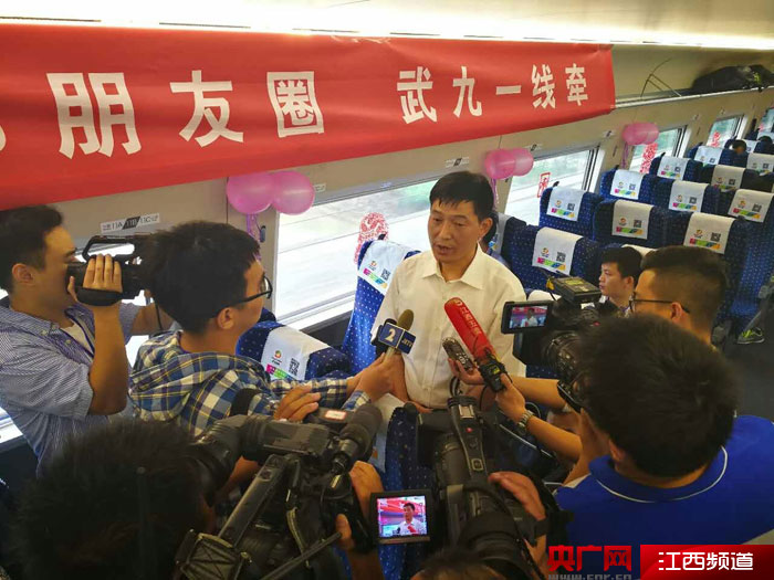 媒體記者乘坐的是G488次列車,車身呈流線型,簡單優(yōu)美,還貼上了許多“厲害了 我的國”標志。上車后,昌九城際股份有限公司負責人為大家介紹武九高鐵建設情況,并表示坐上自己建的高鐵感覺非常開心、自豪。