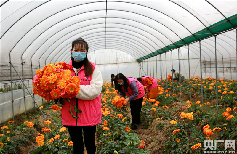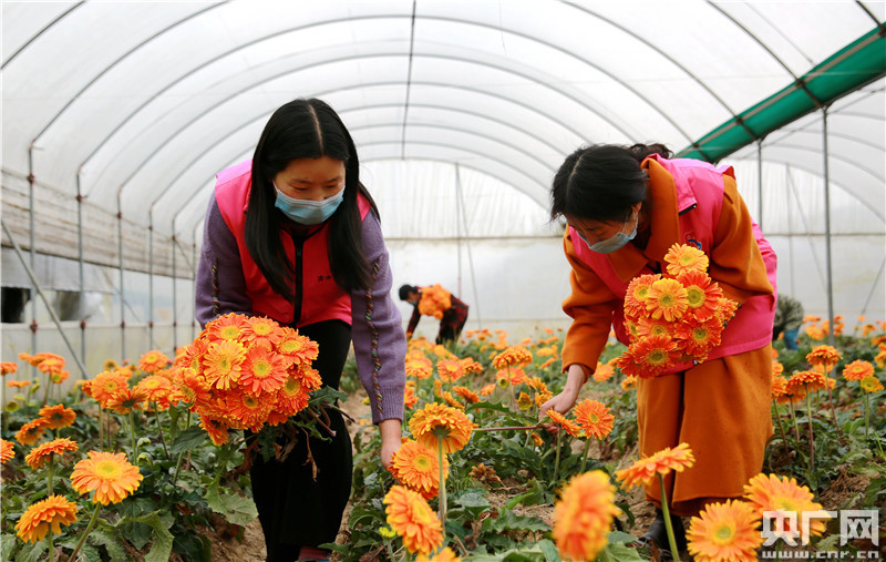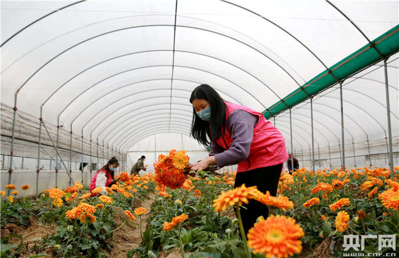 2020年3月3日,江西省吉安市吉水縣黃橋鎮(zhèn)沈塘村金太陽花卉基地,黃橋鎮(zhèn)巾幗志愿者正在幫助種植戶采摘花卉。