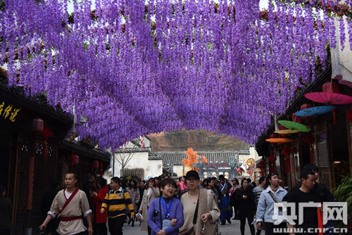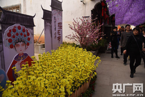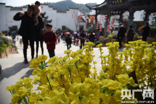 陽春三月,婺源夢里老家舉辦“探花節(jié)”,五彩繽紛的花朵把廣場、街道裝扮一新,吸引了眾多游客前來賞花游玩。圖為3月15日,游客在婺源夢里老家用五彩繽紛花朵裝扮一新的“花街”參觀游覽。(央廣網(wǎng)發(fā) 通訊員單長華攝)