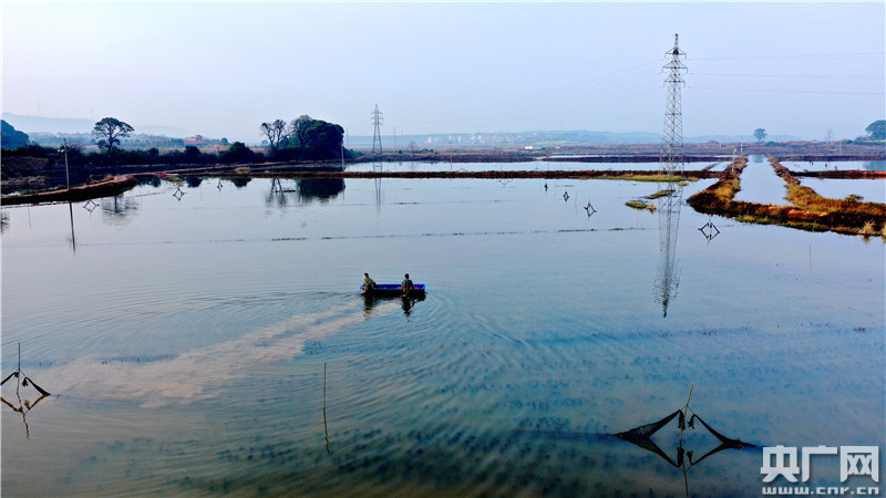 2020年2月26日,江西省吉安市吉水縣文峰鎮(zhèn)葛山村益農(nóng)藕蝦共作基地,養(yǎng)殖戶劉志回將運(yùn)回的蝦苗投放藕池。
