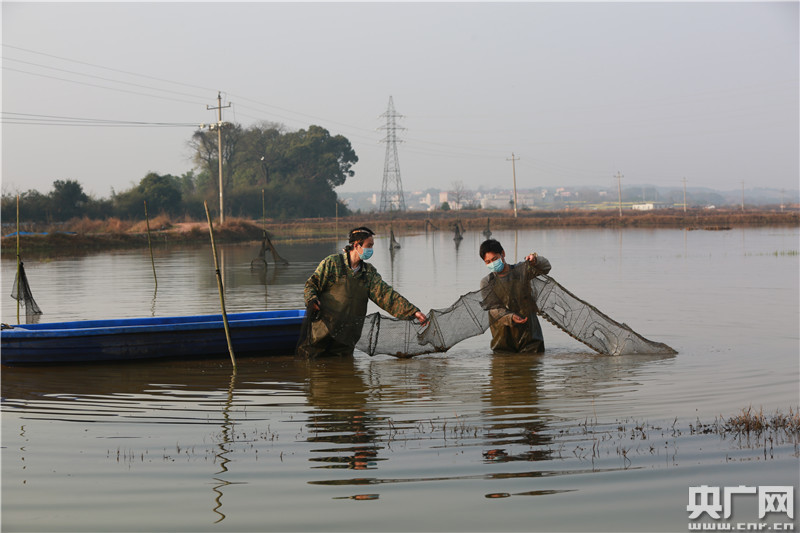 2020年2月26日,江西省吉安市吉水縣楓江鎮(zhèn)楊家塘村龍升漁業(yè)基地,蝦農(nóng)正在起獲蝦苗。