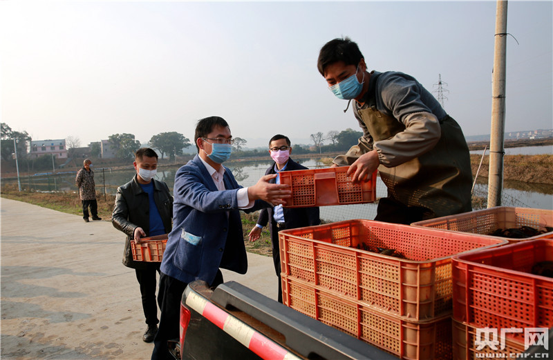 2020年2月26日,江西省吉安市吉水縣楓江鎮(zhèn)楊家塘村龍升漁業(yè)基地,大家一起為蝦苗裝車。