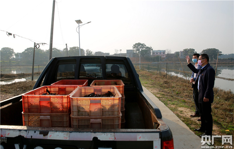 2020年2月26日,江西省吉安市吉水縣楓江鎮(zhèn)楊家塘村龍升漁業(yè)基地,駐村干部王鋒(左二)陳海龍(右三)正在一起查看小龍蝦苗生長情況。