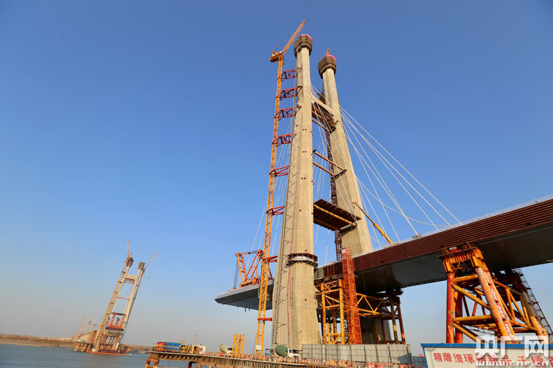 安九鐵路鳊魚洲長江大橋北側(cè)位于湖北黃梅縣、南側(cè)位于江西九江市,為全線關(guān)鍵性控制工程,是京港高鐵過江通道。大橋?yàn)樗木鐵路大橋,其中兩線為高鐵線,時(shí)速350公里;預(yù)留兩線為客貨線,時(shí)速200公里。鳊魚洲長江大橋?yàn)橹骺?72米,全長1320米的雙塔雙索面交叉索斜拉橋。中鐵大橋局安九項(xiàng)目經(jīng)理王貴明介紹:“大橋采用交叉索的設(shè)計(jì),主要是為了提高大橋的剛度,彌補(bǔ)了大跨度鋼箱梁剛度小的不足,同時(shí)兼顧了經(jīng)濟(jì)性與實(shí)用性。”