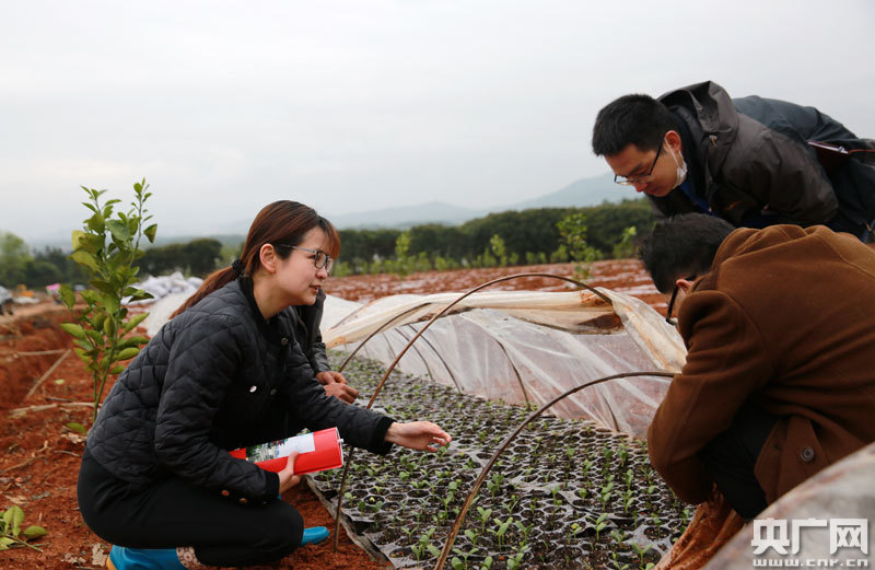 劉旸瑒(左)和工作隊隊員一起查看西瓜秧苗生長情況