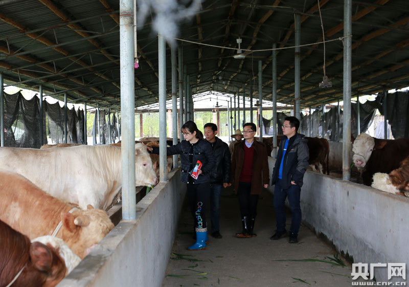 劉旸瑒(左)和工作隊隊員一起商討擴大肉牛養(yǎng)殖規(guī)模事宜
