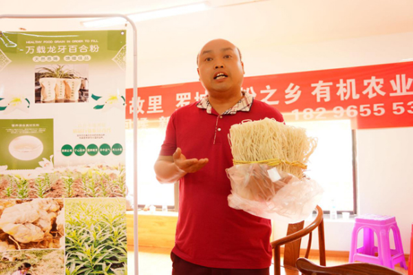 來自江西萬載縣的農(nóng)場主甘奉孝向記者介紹羅城手工米粉、有機百合粉等特色農(nóng)產(chǎn)品。