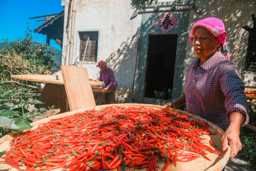 立秋當(dāng)天,篁嶺曬秋大媽們忙著洗曬辣椒,在五桂堂觀景臺(tái)用辣椒擺出“秋”字喜迎立秋到來,也吸引眾多游客駐足拍照。篁嶺古村也舉行了懸秤稱人,貼秋膘,吃粿湯,啃秋等傳統(tǒng)習(xí)俗。
