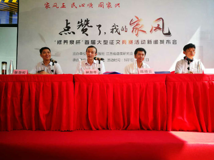 央廣網(wǎng)南昌8月6日消息(胡斐)8月6日上午,由江西日報社和江西省譜牒研究會聯(lián)合主辦、新法制報社承辦的修養(yǎng)泉杯首屆“點贊了,我的家風”大型征文競賽活動新聞發(fā)布會在經(jīng)開正榮府隆重舉行。主辦單位江西省譜牒研究會林加奇會長、江西日報社副總編輯陳曉云,活動冠名單位修養(yǎng)泉劉亮平總經(jīng)理出席了本次活動。江西省譜牒研究會副會長兼秘書長張勁松主持。