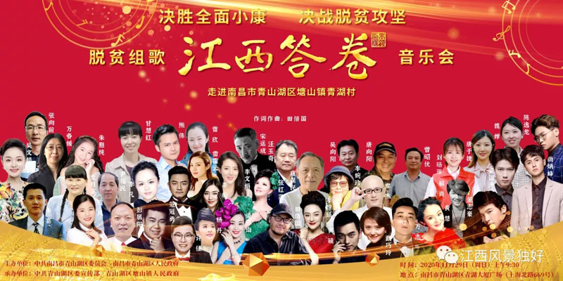 近日,一場以“決勝全面小康、決戰(zhàn)脫貧攻堅”為主題的脫貧組歌《江西答卷》音樂會(田信國作詞作曲)在南昌市青山湖區(qū)塘山鎮(zhèn)青湖村廣場首演。支月英、程風(fēng)、康保民、宋運成、程波、張紅英、李凡、李盼、李瓊瑤、吳文婷、廖杰、戴巧玲等300余名藝術(shù)家和文化文藝志愿者為廣大市民帶來了一場藝術(shù)盛宴,讓大家忘卻初冬的寒意,感受到了陣陣暖意。