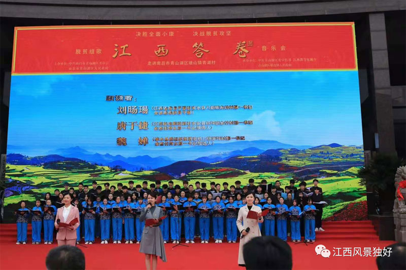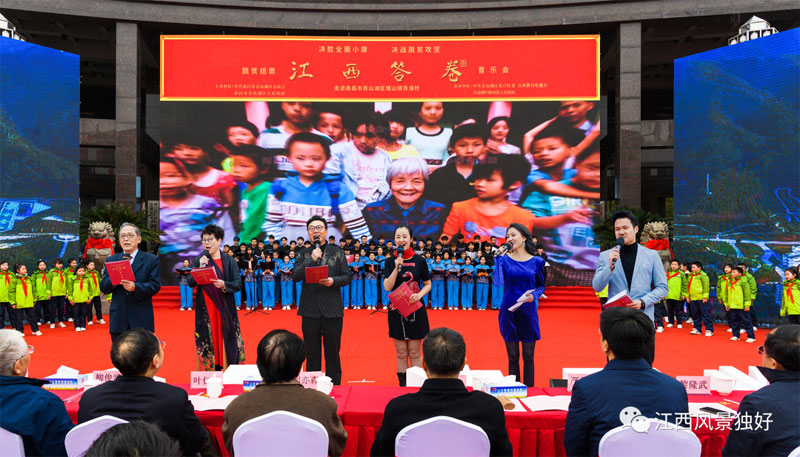 江西是革命老區(qū),曾經(jīng)為中國革命做出過巨大犧牲和巨大貢獻(xiàn)。江西也是全國脫貧攻堅主戰(zhàn)場之一。全省25個貧困縣都是重點老區(qū)縣,大部分處于贛南等原中央蘇區(qū)。其中,24個為國定貧困縣,1個為省定貧困縣。2020年4月26日,江西省政府召開新聞發(fā)布會,正式宣布于都縣、興國縣、寧都縣、贛縣區(qū)、鄱陽縣、修水縣、都昌縣7個貧困縣(區(qū))脫貧退出,這是我省第四批次貧困縣脫貧退出。至此,全省25個貧困縣全部脫貧退出,意味著歷史性解決江西老區(qū)群眾絕對貧困問題,這是我省扶貧開發(fā)史上具有里程碑意義的重大事件。對此,開場曲《老表的掌聲響起來》生動表達(dá)了老區(qū)群眾的激動與祝福:“老表的掌聲響起來,映山紅花兒在盛開。脫貧宣言暖民心,決勝小康大步邁!老表的掌聲響起來,千萬顆心兒在期待。鄉(xiāng)村振興奏凱歌,美好生活樂開懷……老表的掌聲響起來!江西好運當(dāng)頭,老表幸福常在!”