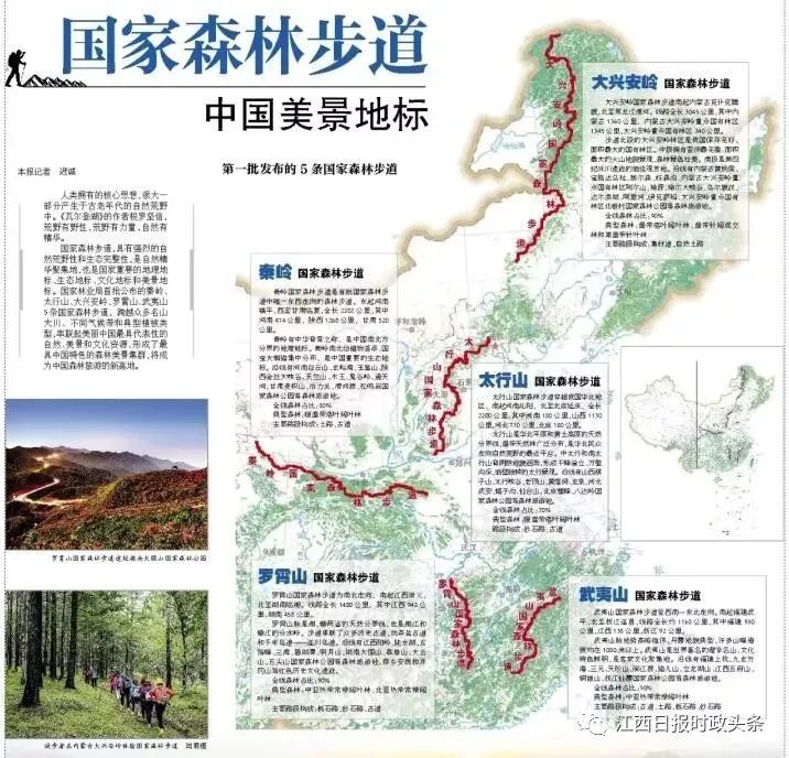 2018年,中共中央、國(guó)務(wù)院印發(fā)了《國(guó)家鄉(xiāng)村振興戰(zhàn)略規(guī)劃(2018-2022年)》,要求在貧困地區(qū)建設(shè)一批國(guó)家森林步道。2019年12月新修訂的《中華人民共和國(guó)森林法》明確把“森林步道”納入林業(yè)建設(shè)范疇。國(guó)家林草局和各相關(guān)部委把國(guó)家森林步道建設(shè)作為自然生態(tài)與人文生態(tài)相結(jié)合的重要抓手,發(fā)布了《國(guó)家森林步道建設(shè)規(guī)范》,探索推進(jìn)國(guó)家森林步道體系建設(shè)。2017年首批國(guó)家森林步道公布以來(lái),我國(guó)已公布了3批12條國(guó)家森林步道,分別是秦嶺、太行山、大興安嶺、武夷山、羅霄山、天目山、南嶺、苗嶺、橫斷山、小興安嶺、大別山、武陵山國(guó)家森林步道,沿線途經(jīng)20個(gè)省份,全程超過(guò)2.2萬(wàn)公里。