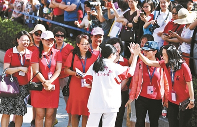 人大附中送考團(tuán)身著紅色“戰(zhàn)袍”為考生送考攝影/本報(bào)記者 崔峻