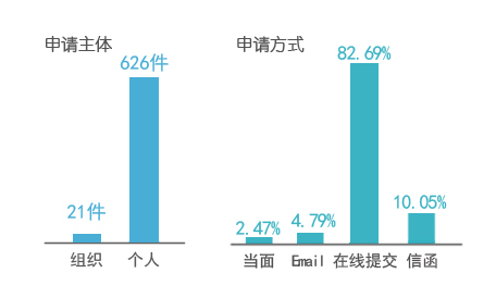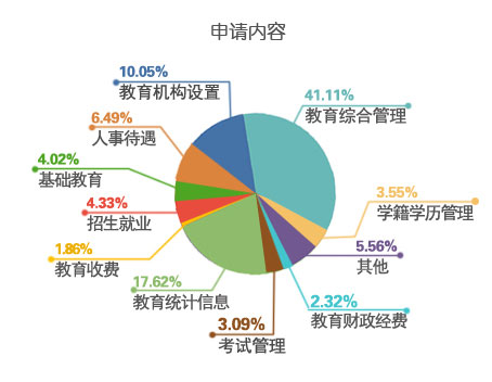 報告顯示,1月1日至12月31日,共收到公民、法人和其他組織通過各種形式提出的信息公開申請647件,較2014年的281件增長了130%。從申請的主體看,公民個人提出的申請626件、其他組織提出的申請21件。從申請方式看,當面申請16件,占2.47%;以電子郵件方式申請31件,占4.79%;以紙質(zhì)信函方式申請65件,占10.05%;以在線提交方式申請535件,占82.69%。涉及教育綜合管理的266件,占41.11%;涉及教育統(tǒng)計信息的114件,占17.62%;涉及教育機構(gòu)設置的65件,占10.05%;涉及人事待遇的42件,占6.49%;涉及招生就業(yè)的28件,占4.33%;涉及基礎教育的26件,占4.02%;涉及學籍學歷管理的23件,占3.55%;涉及考試管理的20件,占3.09%;涉及教育財政經(jīng)費的15件,占2.32%;涉及教育收費的12件,占1.86%;其他36件,占5.56%。申請內(nèi)容涉及教育部20個業(yè)務司局。