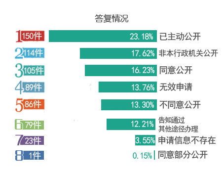 報告顯示,647件申請已全部按時答復申請人,其中“已主動公開”的150件,占23.18%;“同意公開”的105件,占16.23%;“同意部分公開”的1件,占0.15%;“不同意公開”的86件,占13.30%;“不屬于本行政機關公開”的114件,占17.62%;“申請信息不存在”的23件,占3.55%;“告知通過其他途徑辦理”的79件,占12.21%,無效申請89件,占13.76%)。