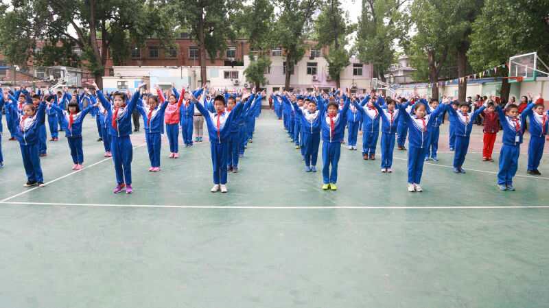 課間操展示活動(dòng)中,主要由學(xué)生展示國(guó)家規(guī)定的《希望風(fēng)帆》、《七彩陽(yáng)光》兩套廣播體操和師生自主編創(chuàng)的《健康歌》、《水果拳》兩套課間操。