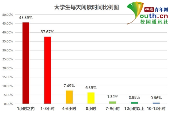 根據(jù)中國青年網(wǎng)記者調(diào)查顯示,每天閱讀時間在1小時之內(nèi)的學(xué)生占45.59%,其次為1-3小時、4-6小時,分別占37.67%和7.49%。還有6.39%的大學(xué)生每天閱讀時間為0。由此可以看出,51.98%的學(xué)生每天閱讀時長不超過1小時。