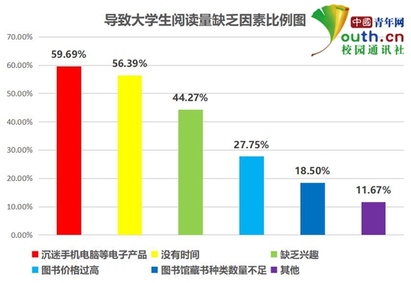 目前,許多大學(xué)生表示閱讀情況不容樂觀,那么,是什么因素會導(dǎo)致閱讀量缺乏呢?根據(jù)中國青年網(wǎng)記者調(diào)查顯示,59.69%的學(xué)生認(rèn)為是“沉迷手機(jī)電腦等電子產(chǎn)品”,其次“沒有時間”閱讀和“缺乏興趣”,各占56.39%、44.27%。此外,還有18.5%的學(xué)生認(rèn)為“圖書館藏書種類數(shù)量不足”導(dǎo)致閱讀量缺乏。