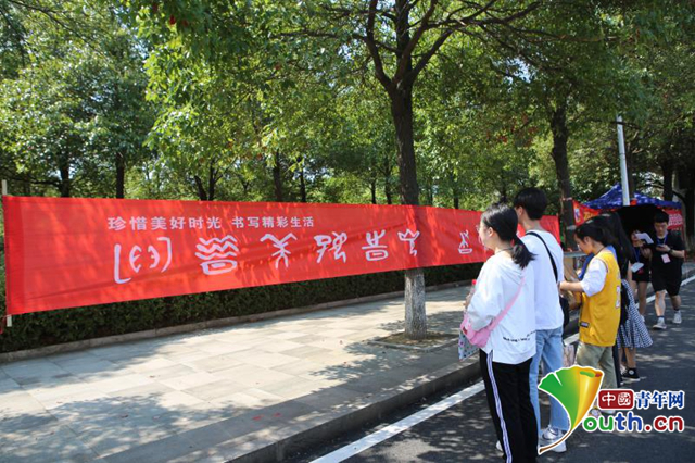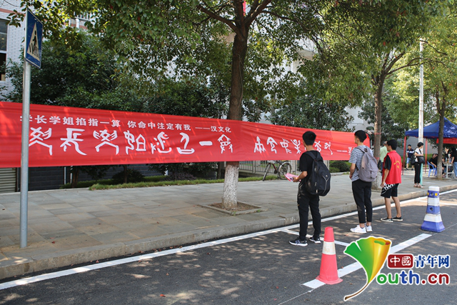 9月8日是湖南民族職業(yè)學(xué)院新生報(bào)到的日子,校園里掛滿了迎新橫幅。與其他學(xué)校的迎新橫幅不同的是,這里所有的橫幅內(nèi)容都采用甲骨文形式,吸引了不少師生駐足觀看。
