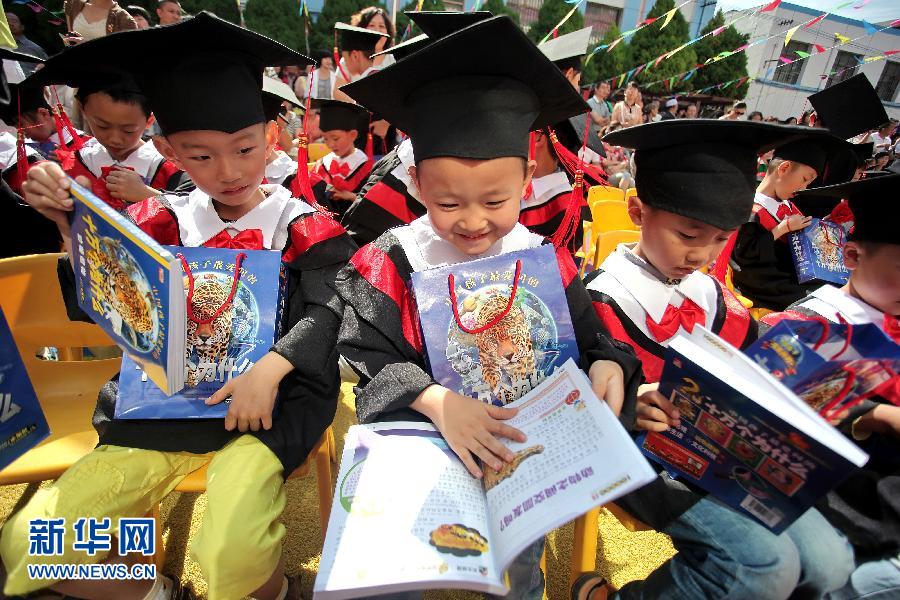 7月4日,甘肅省平?jīng)鍪杏變簣@的小朋友們在翻閱收到的畢業(yè)禮物——《十萬個為什么》圖書。當(dāng)日,甘肅省平?jīng)鍪杏變簣@舉行2014屆大班小朋友畢業(yè)典禮,200多名小朋友結(jié)束幼兒園的生活,即將進入小學(xué)開始學(xué)習(xí)。孩子們身著迷你畢業(yè)服和帽子,在典禮上唱畢業(yè)歌,互換禮物。新華社發(fā)(楊昕 攝)