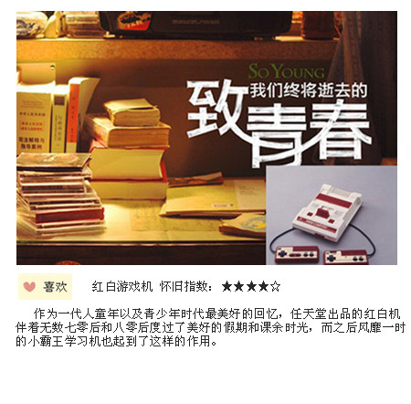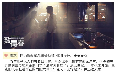 趙薇首次執(zhí)掌導演的電影《致我們終將逝去的青春》公映后票房不菲,該影片據(jù)同名網(wǎng)絡(luò)小說 改編,背景放在九十年代的大學校園,為了契合時代背景,主創(chuàng)團隊精心挑選了獨屬于當時的特定物 件向那個時代致敬:上下鋪的宿舍、隨處可見的硫化帆布鞋、時髦發(fā)型,紅白游戲機、BP機以及片中 的插曲等都充滿了濃濃的懷舊氛圍。【詳情】...