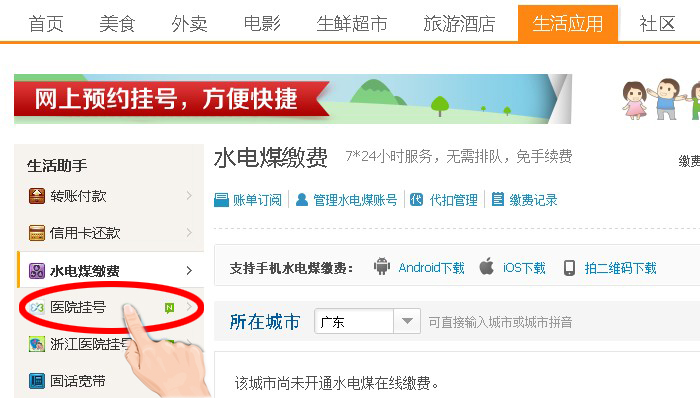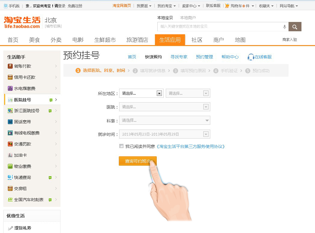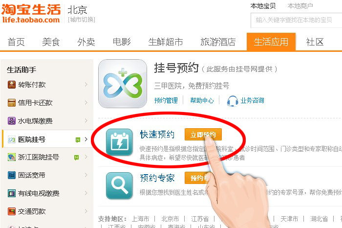 如果能夠在加上通過(guò)網(wǎng)絡(luò)預(yù)約掛號(hào),是不是會(huì)覺(jué)得幸福感增加很多呢?據(jù)報(bào)道,現(xiàn)在全國(guó)18個(gè)省市的7萬(wàn)名專家已經(jīng)開通網(wǎng)上預(yù)約服務(wù),其中超過(guò)6成為三甲醫(yī)院。您只要上上淘寶,動(dòng)動(dòng)手指,就能預(yù)約掛號(hào)了。 把掛號(hào)這件困難事兒搬到電商的地盤來(lái)解決,是不是真的像想象中的那么美那么無(wú)敵?【詳細(xì)】 接下來(lái)小編就帶您體驗(yàn)一下淘寶掛號(hào)的流程: |