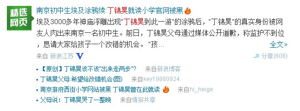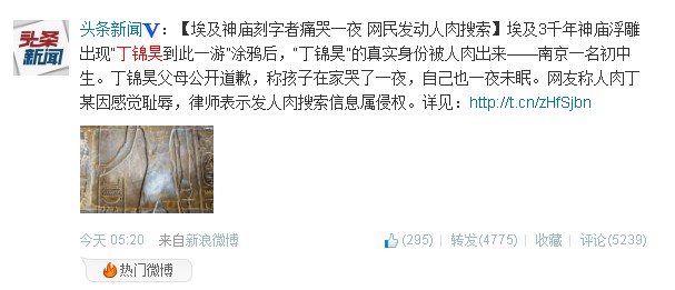 當(dāng)我們回過頭來再思考一下整個(gè)事件,對(duì)于丁錦昊而言,無疑他犯了錯(cuò)誤,他讓有3500年歷史的盧克索神廟在哭泣了,在丁錦昊與它那場(chǎng)跨越千年的對(duì)話中它蒙羞了,它已走過了三千多年的漫長歲月,在公元2013年卻被刻上了永不可抹去的傷痕。但之后網(wǎng)友的人肉搜索和口誅筆伐對(duì)于一個(gè)13歲的孩子是否過于殘忍了?