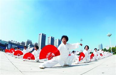 沈陽市跆拳道協(xié)會(huì)會(huì)員表演太極扇 展演隊(duì)伍中人數(shù)最多的,還是群眾體育團(tuán)隊(duì)。作為群眾體育一項(xiàng)重要的健身成果,廣場舞已經(jīng)從中國走向世界,活動(dòng)現(xiàn)場,在優(yōu)美的舞曲聲中,廣場舞團(tuán)隊(duì)翩翩起舞;健步走是近年來群眾喜聞樂見的運(yùn)動(dòng)方式,在活動(dòng)現(xiàn)場,健步走團(tuán)隊(duì)就為人們展示了遼沈群眾的風(fēng)采;秧歌是東北地區(qū)的特色,如今秧歌也與群眾體育融為一體,活動(dòng)現(xiàn)場,在威風(fēng)鑼鼓的伴奏下,健身秧歌隊(duì)伍載歌載舞,表現(xiàn)出了極佳的精神風(fēng)貌; 手拍鼓或許并不難學(xué),但數(shù)百人一起表演卻不容易,活動(dòng)現(xiàn)場,手拍鼓團(tuán)隊(duì)動(dòng)作整齊劃一,讓人嘆為觀止。太極扇是展演的高潮部分,背景音樂是鏗鏘有力的《中國功夫》,讓所有人的心仿佛都跟著一起跳動(dòng)。 -