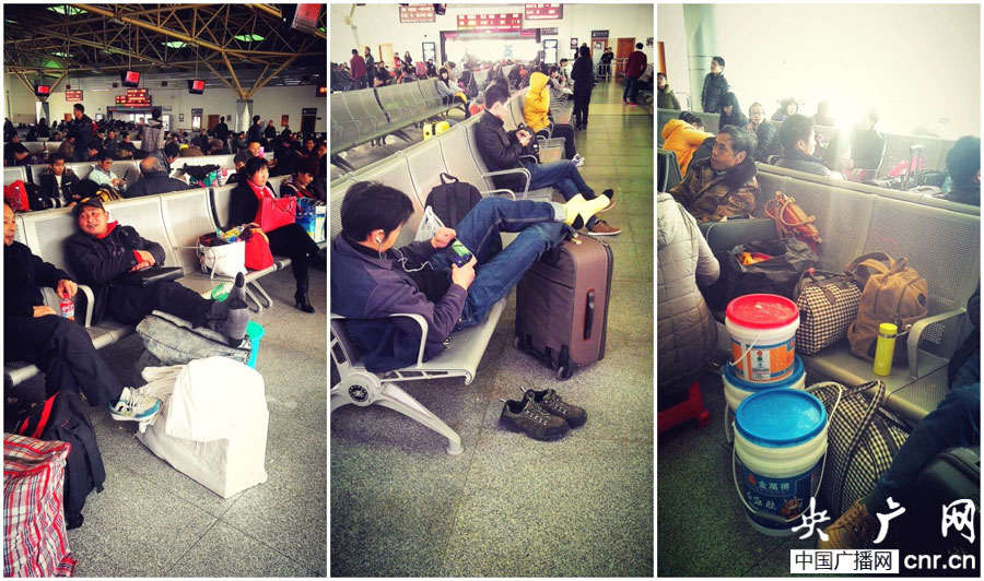 2015年2月10日福州火車站旅客在候車廳脫鞋子、行李占座椅不文明行為。(圖片來源:南昌鐵路局)