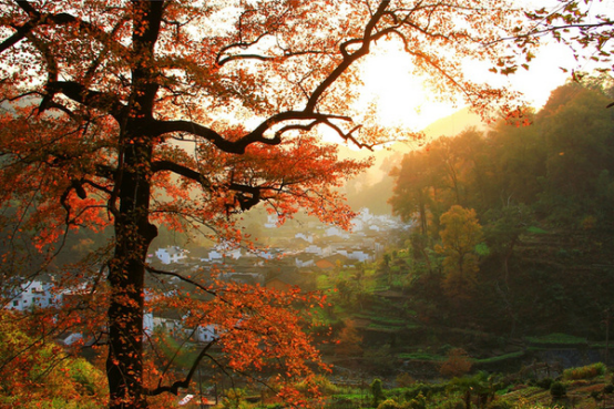11月中旬至12月上旬,是欣賞婺源秋色的最佳時間。此時的婺源鄉(xiāng)村正值秋濃,那些遍布于村頭鄉(xiāng)間及山野溪邊的古木老樹紛紛開始變色換妝,一棵棵楓樹也突現(xiàn)出英雄紅色,恣意盡顯其風(fēng)流于一時。古老的村落粉墻黛瓦,清澈的溪水小橋人家,秋后的田野阡陌縱橫,火紅的楓葉相映生輝。晨曦暮靄中,炊煙裊裊,雞鳴犬吠,此情此景就是婺源鄉(xiāng)村的秋天,也正是我們尋找中的理想意境。