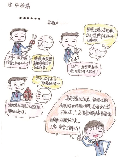“不僅從售票、檢票方面,還有文明出行,都讓大家通過漫畫的形式掌握!标懍庩戧懤m(xù)續(xù)地畫了幾百幅漫畫,并通過她單位的官方對(duì)外發(fā)布。很多看過漫畫的旅客也對(duì)這種方式十分認(rèn)可。“比較生動(dòng),小孩子看了也會(huì)記得住!币晃宦每驼f。下一步,這些漫畫將制作成手冊(cè)在春運(yùn)開始后分發(fā)給前來乘車的旅客們,以方便他們的出行。綜合