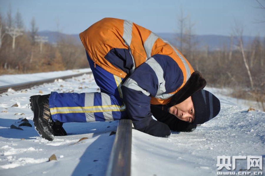 哈爾濱鐵路局海拉爾工務段金林線路工區(qū)的工人師傅將臉盡可能的貼在軌道上,目測查看軌道的平直度。