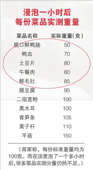 幾日后,北京商報(bào)記者以普通顧客身份再次前往姑姑宴國(guó)瑞中心店,按照此前馬女士一行人所選購(gòu)的冒菜重新點(diǎn)了一份,打包帶回后進(jìn)行了稱重。盡管路上花費(fèi)了一個(gè)多小時(shí),但在湯水里泡了許久的脆口鮮鴨腸、脆豆腐、鮮毛肚、鴨血、寬粉、午餐肉等分量仍然不足,鴨腸只有50克、鴨血70克、土豆片也只有80克。除了平菇,其他幾種菜也只是剛夠量(詳見表格)。