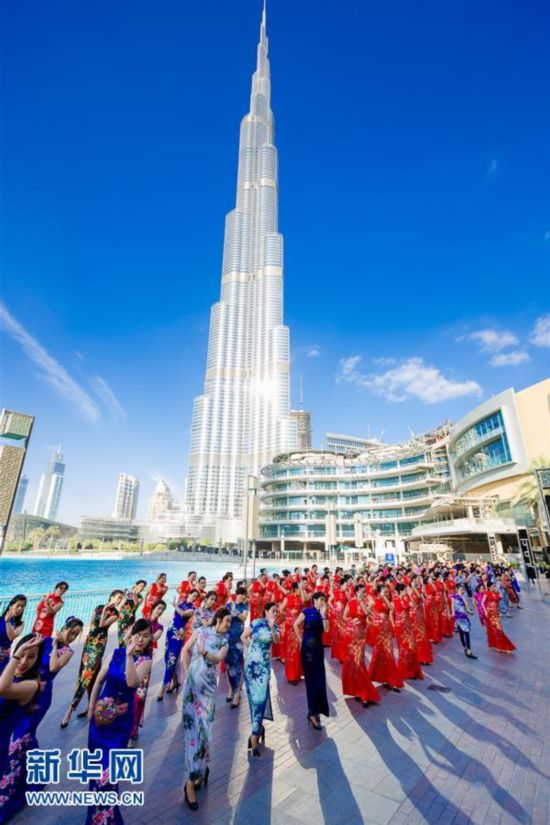 1月15日,身著旗袍的快閃活動(dòng)參與者在阿聯(lián)酋迪拜世界最高建筑——哈利法塔腳下表演。新華社發(fā)(張澍民攝)